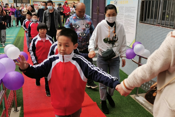 在全校師生的夾道歡迎下,在家長的陪同下,一年級的9名新生滿懷好奇地踏上紅毯,通過氣球拱門,一路歡笑步入教室。在老師的引導下,學生和家長有序就座。