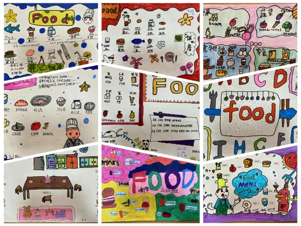 三年級(jí)同學(xué)們繪制以“food”為主題的手抄報(bào),向大家展示了他們精心制作的美食菜單。他們精心設(shè)計(jì),開動(dòng)腦筋,不僅鞏固了本單元的基礎(chǔ)知識(shí),還拓寬了英語(yǔ)文化視野。