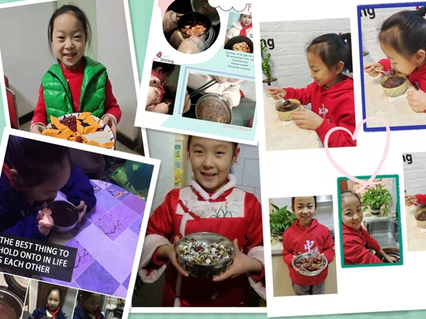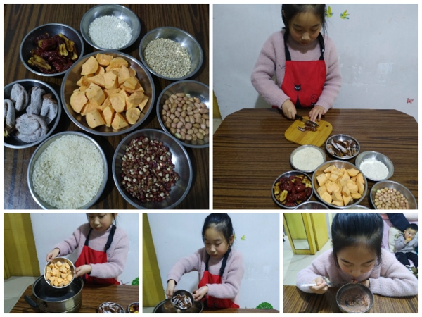 因疫情原因,隊員們在學(xué)校的倡議下紛紛居家開展了主題實踐教育活動。他們在父母的帶領(lǐng)下一起搜集臘八節(jié)資料,了解臘八節(jié)的起源、習(xí)俗,同時在父母的幫助下一起購買臘八粥的原材料,了解制作臘八粥流程,和父母一起做臘八粥,體驗傳統(tǒng)節(jié)日的美好。