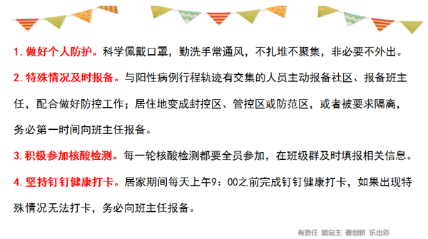 目前疫情形式依然嚴峻,全市上下正在全力以赴在最短時間內(nèi)撲滅疫情,堅決打好疫情防控這場攻堅戰(zhàn)。各班級針對疫情防控、釘釘打卡、個人防護、核酸檢測等方面提出了具體要求,出彩果兒和家長們要嚴格落實防疫要求,生命至高無上,安全牢記心間。
