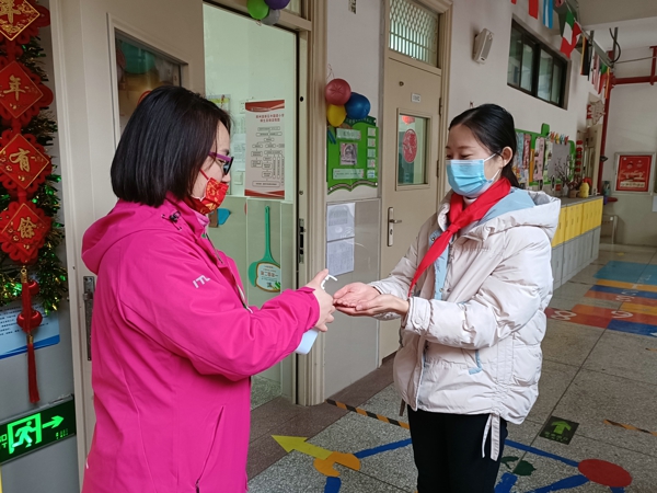學(xué)生在正副班主任帶領(lǐng)下保持1.5米間距,有序進(jìn)班。副班主任在教室門口組織學(xué)生手部消毒。班主任對本班學(xué)生進(jìn)行體溫測量、消毒工作,同時(shí)填寫晨午檢記錄。