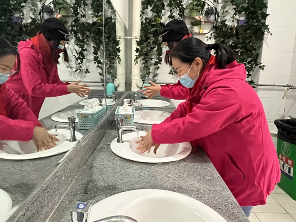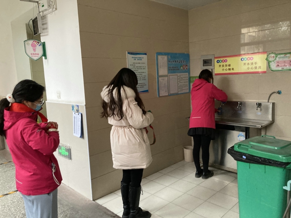下課時(shí),正、副班主任立即到班,分工組織學(xué)生課間分區(qū)、分組如廁、接水。學(xué)生有秩序排隊(duì)走出教室,前往洗手間。期間戴好口罩,保持1.5米距離。每一層樓都有網(wǎng)格長教師、保潔重點(diǎn)提醒學(xué)生如廁時(shí)講秩序、便后正確洗手,洗手間配有洗手液、消毒液等。