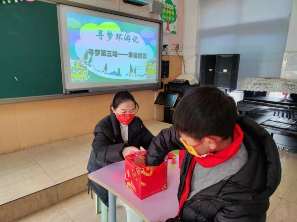 尋夢第一站——魔法轉(zhuǎn)盤,同學(xué)們根據(jù)轉(zhuǎn)盤結(jié)果選擇相應(yīng)的卡片,快速答出卡片上的口算題,檢測孩子們的計算能力。同學(xué)們都躍躍欲試,興趣盎然。