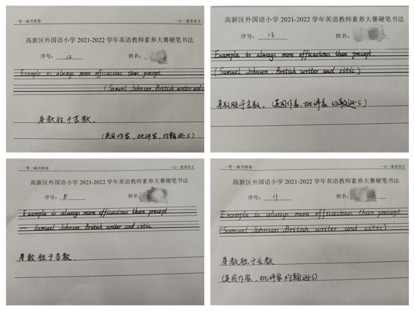 小學是學生學習成長的奠基階段,良好的書寫習慣離不開老師的示范引領。英語文本的規(guī)范書寫和正確翻譯,是英語教師的基本功。學科組采用現場抽簽、臨時書寫翻譯的形式,對英語組全體教師的基本功進行了全面考查。工整、精美的作品體現出精湛的技藝。