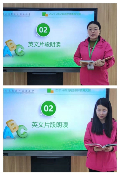 英語教師的口語朗讀是必備素養(yǎng),潛移默化中對學生的長足發(fā)展起著重要作用。依然是采用抽簽的形式,教師隨機上臺進行課文朗讀,發(fā)音規(guī)則、朗讀技巧、臺風面貌均全面體現,學科組骨干教師進行現場評價。