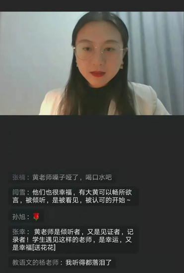 她氣質(zhì)溫婉、眉目如畫(huà),是我們心目中的最美教師;她教而有思、研而有方,是我們語(yǔ)文組的教研組長(zhǎng);她身體力行、愛(ài)生如子,是我們深情凝望的榜樣。第一次在開(kāi)車時(shí),全程聆聽(tīng)了黃老師的講座,導(dǎo)航的嘈雜絲毫不影響我的專注,因?yàn)樗诎嗉?jí)管理中注入的素養(yǎng)的養(yǎng)成,那是班級(jí)管理的深層文化;因?yàn)橛鲆?jiàn)更好的自己、笑草說(shuō)、一封信,追尋班級(jí)管理中的語(yǔ)文味;因?yàn)楸頁(yè)P(yáng)優(yōu)秀、正面引領(lǐng)、拉近師生關(guān)系,讓說(shuō)教變成了悅納。至今還想起,在教學(xué)評(píng)一體化培訓(xùn)時(shí),黃老師的發(fā)言讓我瞬間明白了語(yǔ)文教師應(yīng)具備的素質(zhì)和自己努力的方向。時(shí)常感念曾經(jīng)的指導(dǎo)與幫助,感恩于曾經(jīng)的相聚與今日的學(xué)習(xí),永遠(yuǎn)心懷感激!