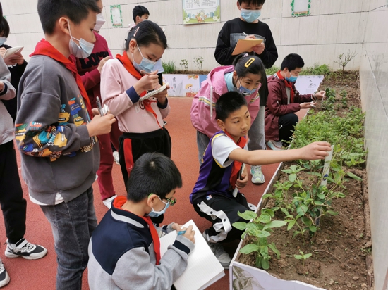 學(xué)生在老師的指導(dǎo)下觀(guān)察著前期種下的中草藥,紫蘇已經(jīng)發(fā)芽,芍藥、金銀花、向日葵抽枝長(zhǎng)葉,薄荷、香菜綠得發(fā)亮,棵棵藥草長(zhǎng)勢(shì)喜人。老師指導(dǎo)學(xué)生通過(guò)“望、聞、摸、量”的方式去觀(guān)察種植園中的一草一木。學(xué)生們積極參加,熱情高漲,通過(guò)細(xì)致觀(guān)察比較,發(fā)現(xiàn)了一些問(wèn)題,為什么同時(shí)種下的金銀花,長(zhǎng)得有的株上葉子多,有的葉子少;為什么同一位置的芍藥也是一高一矮、一胖一瘦。