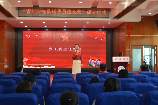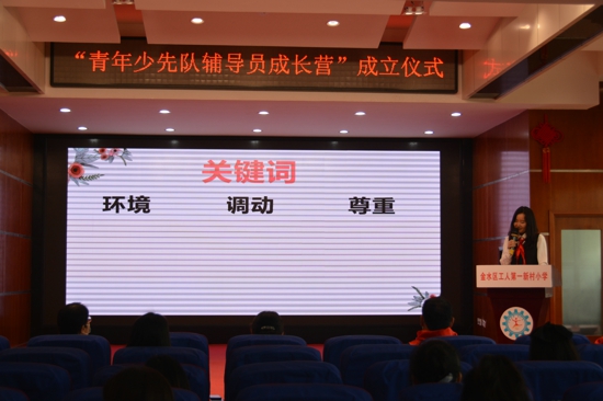 滿(mǎn)懷對(duì)少先隊(duì)工作的熱愛(ài),各中隊(duì)輔導(dǎo)員齊聚報(bào)告廳,期待著這莊嚴(yán)時(shí)刻的到來(lái)。中國(guó)少年先鋒隊(duì)鄭州市金水區(qū)工人第一新村小學(xué)工作委員會(huì)主任孫冬梅首先發(fā)表精彩致辭,贏(yíng)得陣陣掌聲。她從輔導(dǎo)員年齡結(jié)構(gòu)上進(jìn)行了整體分析,年輕化是學(xué)校少先隊(duì)輔導(dǎo)員隊(duì)伍的一大特點(diǎn),也是一大亮點(diǎn),年輕就代表著朝氣,代表著力量,代表著未來(lái)。要依托青年少先隊(duì)輔導(dǎo)員成長(zhǎng)營(yíng)這個(gè)平臺(tái),培育一支業(yè)務(wù)精、素質(zhì)高的輔導(dǎo)員隊(duì)伍,履行好黨交給我們職責(zé),助力少年兒童健康茁壯成長(zhǎng)。接著,大隊(duì)輔導(dǎo)員侯倩倩又對(duì)各青年少先隊(duì)輔導(dǎo)員提出四點(diǎn)要求,希望他們能夠以自身專(zhuān)業(yè)成長(zhǎng)帶動(dòng)學(xué)校少先隊(duì)事業(yè)快速發(fā)展。