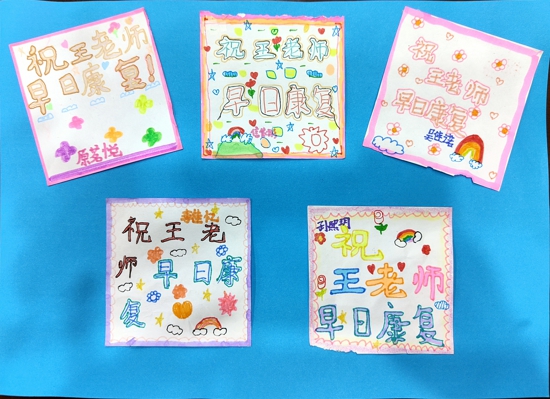 王老師的病情也牽動著學生們的心。下課后,不少學生自發(fā)攙扶王老師走路,還制作帶有祝福語的卡片送給老師。