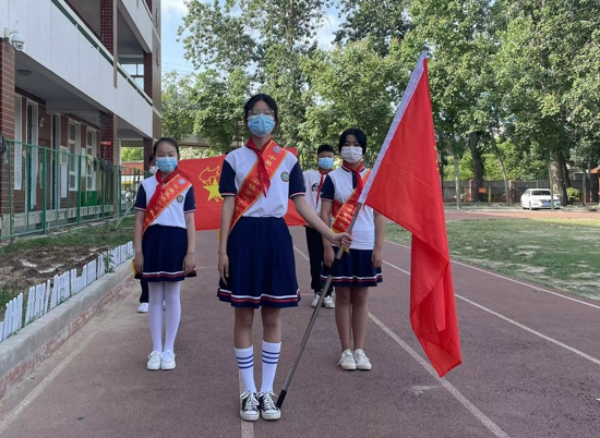 伴隨著莊嚴(yán)的出旗曲,旗手們高擎隊旗,昂首闊步。全體隊員齊唱《中國少年先鋒隊隊歌》,嘹亮的歌聲表達(dá)了同學(xué)們對少先隊組織的崇敬和熱愛。