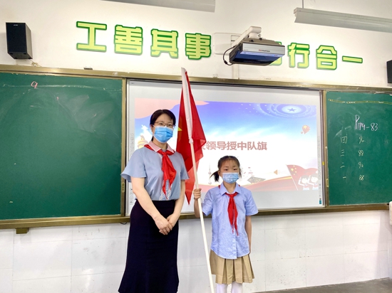 主會場加分會場,釋放你的能量場。在校長孫冬梅的指示下,學(xué)校嚴(yán)格遵守疫情防控要求,將入隊儀式以主會場與分會場相結(jié)合的方式呈現(xiàn)。主會場內(nèi),出旗、宣讀入隊決定等年級共同環(huán)節(jié)提前錄制;分會場內(nèi),戴上紅領(lǐng)巾,授中隊旗,頒發(fā)聘書等環(huán)節(jié)有序進(jìn)行。
