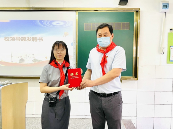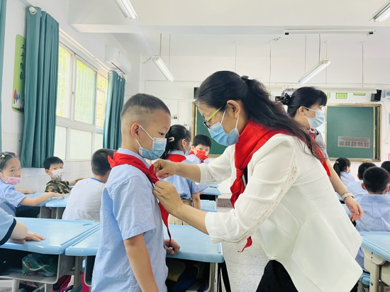 孫校長為新隊員佩戴紅領(lǐng)巾