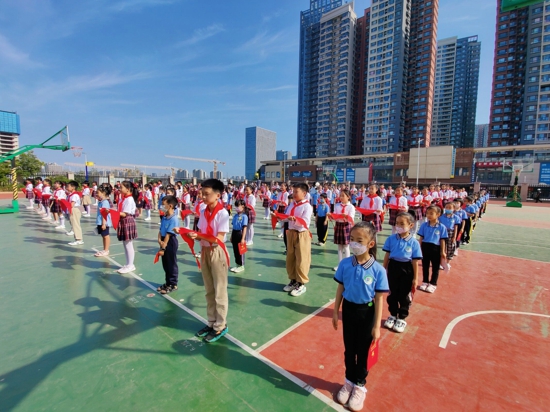 上午8:00,艷陽高照、隊旗飄揚。以“喜迎二十大、爭做好隊員”為主題的新隊員入隊儀式在學校操場上拉開了序幕。少先隊優(yōu)秀代表為參會的學校領導們獻上鮮艷的紅領巾。