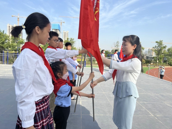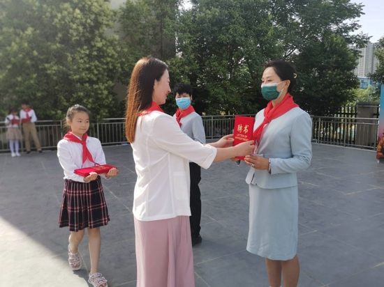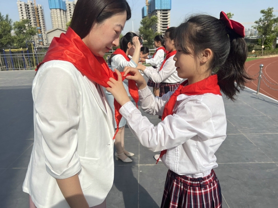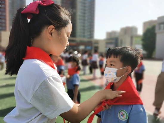 隊員們?yōu)閰膶W校領導帶上紅領巾