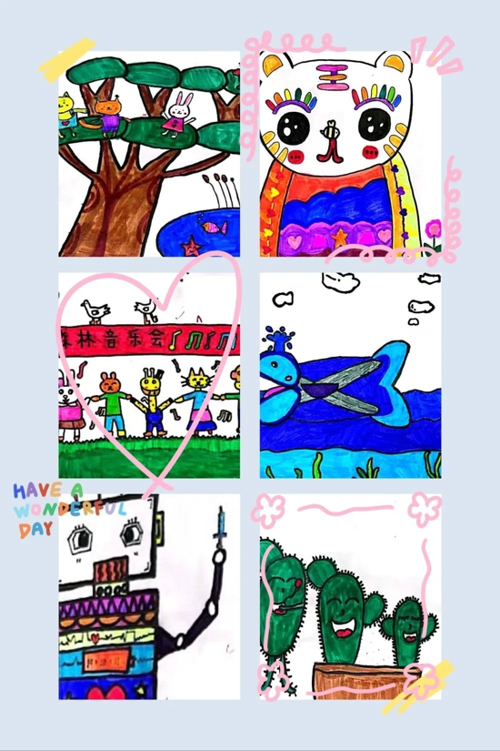 美術(shù)學(xué)科的評(píng)價(jià)主題為《動(dòng)物唱歌的模樣》和《有趣的動(dòng)漫形象》。小嫩芽們根據(jù)題目及繪畫(huà)要求,自由大膽地進(jìn)行創(chuàng)作,他們的作品構(gòu)思新穎,想象豐富,色彩飽滿,線條流暢,畫(huà)面妙趣橫生。接下來(lái)一起來(lái)看看小嫩芽們的創(chuàng)作吧!