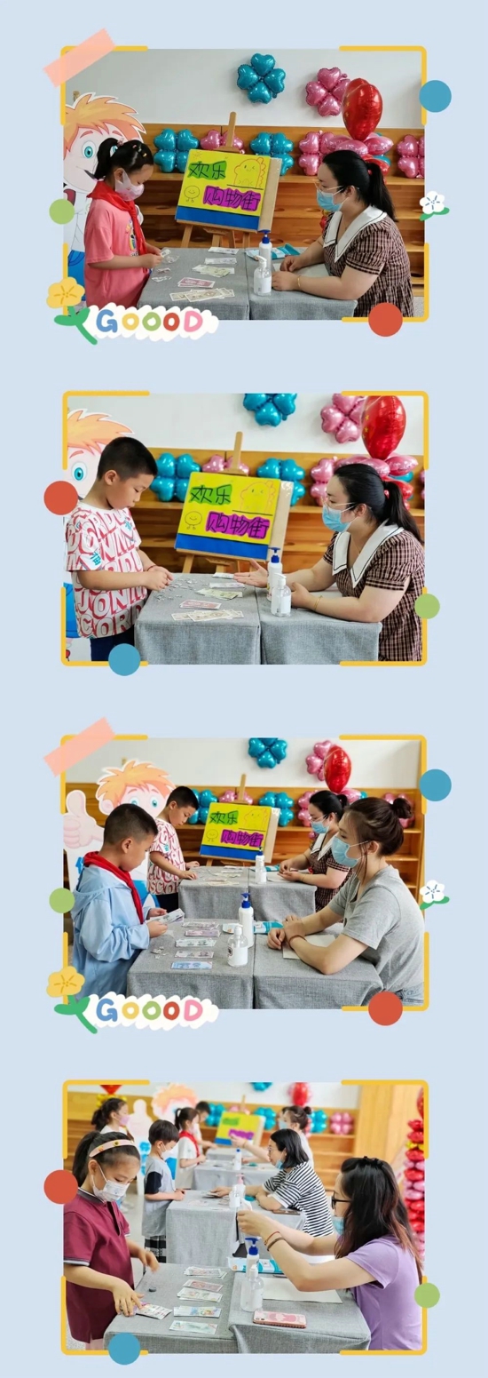 在“歡樂(lè)購(gòu)物街”活動(dòng)現(xiàn)場(chǎng),學(xué)生利用紙幣學(xué)具模擬購(gòu)物活動(dòng),既了解了貨幣的意義,又積累了使用貨幣的經(jīng)驗(yàn)。