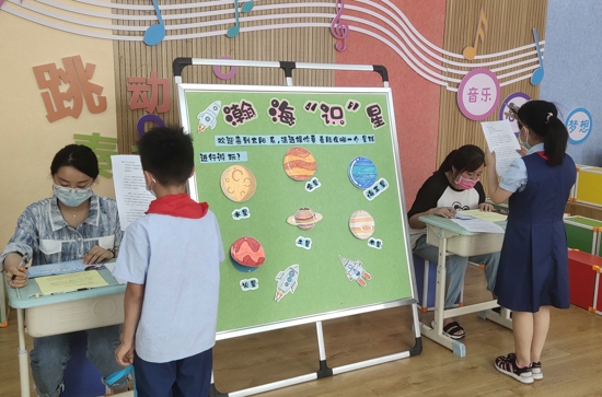 活動(dòng)前期,老師們結(jié)合現(xiàn)階段學(xué)生興趣,聯(lián)系課文《太空生活趣事多》,為二年級學(xué)生精心設(shè)置了喜聞樂見的太空關(guān)卡,其中共設(shè)置了6個(gè)關(guān)卡:“誦”入云霄、“吟”河暢游、瀚海“識”星、“閱”球探秘、“基”石之戰(zhàn)、暢聊宇宙。通過太空歷險(xiǎn)的游戲方式設(shè)置,分別對背誦、朗讀、識字、閱讀、寫字及口語交際進(jìn)行全方位、多角度評價(jià)。