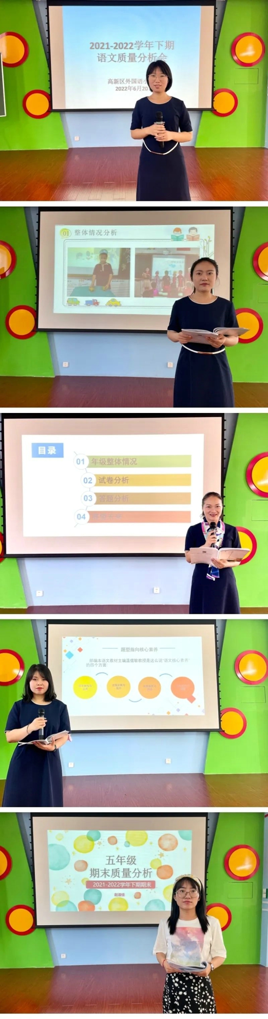 語文組在王新華老師的主持下,各年級(jí)教師代表分別對(duì)本年級(jí)的學(xué)科質(zhì)量,從多角度、多層次進(jìn)行了深度分析。低學(xué)段教師代表馮路路針對(duì)一二年級(jí)主題為“嫩芽享雙減,語文展素養(yǎng)”的綜合素能闖關(guān)測評(píng)展開了詳盡的介紹;中學(xué)段教師代表萬艷娜和陳若夢(mèng)對(duì)本學(xué)段的總結(jié)性測評(píng)情況做了整體梳理,聚焦關(guān)鍵環(huán)節(jié)、結(jié)合日常教學(xué)提出了切實(shí)可行的解決措施;高學(xué)段教師代表趙淑佳針對(duì)評(píng)價(jià)改革,聚焦閱讀理解、情境習(xí)作,以及今后教學(xué)中應(yīng)加強(qiáng)的方面提出了建議,對(duì)本次測評(píng)體系進(jìn)行了研討剖析,對(duì)學(xué)生素養(yǎng)發(fā)展研討出進(jìn)一步優(yōu)化的方案。
