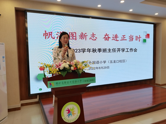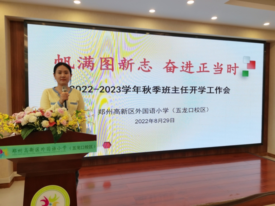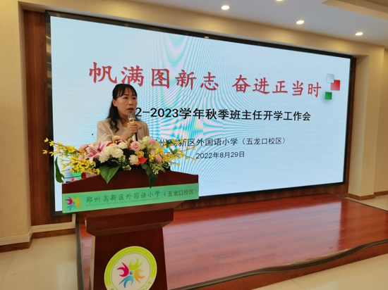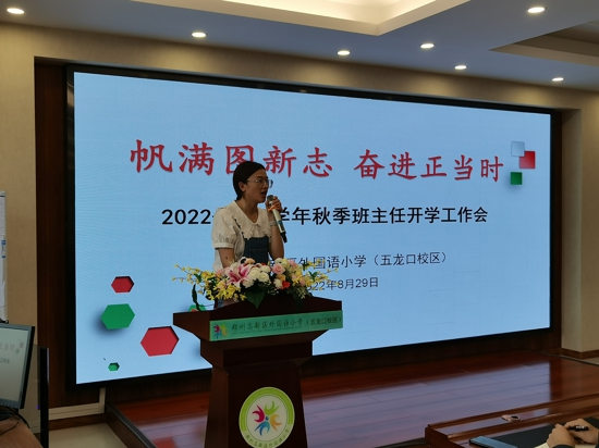 中新河南網(wǎng)9月1日電(吳勇強)2022年8月29日上午, 鄭州高新區(qū)外國語小學(xué)五龍口校區(qū)召開了以”帆滿圖新志奮進正當時”為主題的新學(xué)期班主任工作會議。會議由德育處主任于姍姍主持,校長韓輝、副校長于艷麗、書記任高尚和全體班主任教師參加了會議。