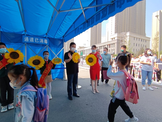 學(xué)校門(mén)口領(lǐng)導(dǎo)歡迎一年級(jí)悅寶貝