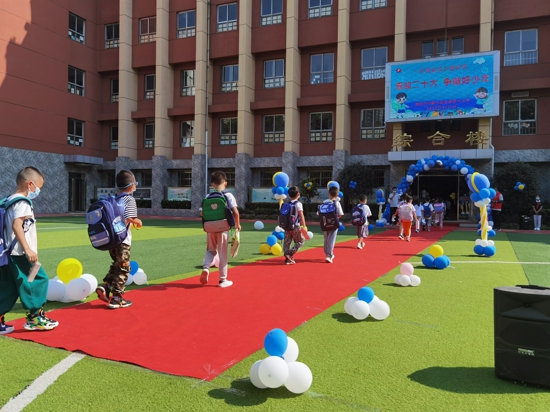 下午2時30分,建三小學一年級新生戴好口罩,校門口有序測溫,臉上洋溢著微笑走進了美麗的建三校園,開啟了自己的小學生涯。