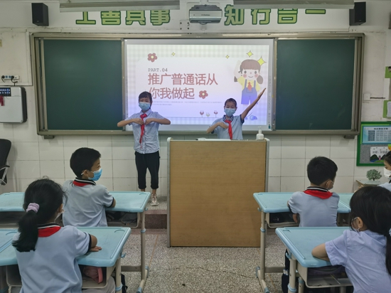 大隊(duì)輔導(dǎo)員胡亞平老師在集體會(huì)上動(dòng)員全校學(xué)生說(shuō)普通話,寫規(guī)范字,鼓勵(lì)學(xué)生熱愛祖國(guó)語(yǔ)言文字,構(gòu)建和諧語(yǔ)言生活,以朝氣蓬勃的少先隊(duì)員形象迎接黨的二十大召開。同時(shí),各班以班級(jí)為單位開展了“推廣普通話,喜迎十二大”主題班隊(duì)會(huì)活動(dòng)。在活動(dòng)中,學(xué)生們認(rèn)真聆聽普通話的發(fā)展史,了解了普通話推廣的意義,積極踴躍參加學(xué)講普通話的朗讀詩(shī)歌、繞口令比賽,氣氛熱烈,活動(dòng)最后,班級(jí)大隊(duì)委作為代表發(fā)出倡儀,倡導(dǎo)每位學(xué)生學(xué)說(shuō)普通話,學(xué)寫規(guī)范字,從自身做起,從你我做起,做中華文化宣傳大使。通過(guò)班隊(duì)會(huì)活動(dòng),涌現(xiàn)出一大批運(yùn)用普通話的優(yōu)秀學(xué)生,在校園里掀起學(xué)習(xí)普通話的熱潮。