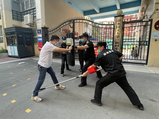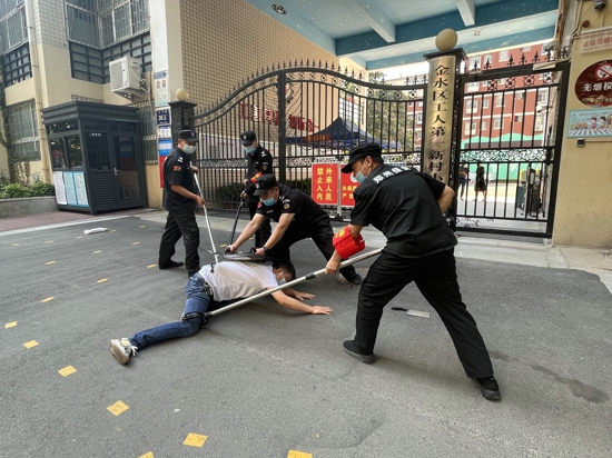 演練開始,一名由老師扮演的“歹徒”欲闖入學校內(nèi),被保安詢問阻攔后,“歹徒”手持利刃想強行闖入,門衛(wèi)室保安見狀迅速做出反應,第一時間摁下報警設備提醒校園內(nèi)老師組織學生撤離,同時拿起防暴盾牌、鋼叉上前阻止,與“歹徒”周旋。