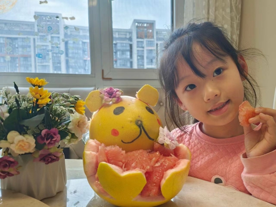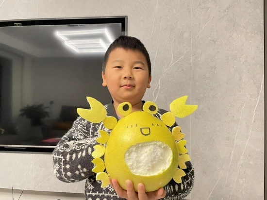 活動中,學生們紛紛展示了自己用柚子制作的各項手工作品。有用柚子做成的果籃,有活潑可愛的螃蟹、活靈活現(xiàn)的袋鼠、有用柚子果肉制作的精美盤畫……一個個造型各異的柚子作品惟妙惟肖。這些作品也都是學生們利用課余時間和家長一起進行制作,制作過程中學生們查閱資料發(fā)揮想象,呈現(xiàn)的作品讓人大開眼界,無不為學生們的動手能力而贊嘆。