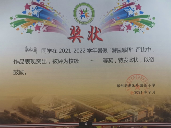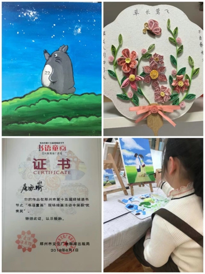 唐湫崳同學(xué)不僅品學(xué)兼優(yōu),還是個(gè)多才多藝的小姑娘。學(xué)習(xí)之余,她喜歡演奏鋼琴,拿到了鋼琴八級(jí)證書;她喜歡繪畫,繪畫作品曾獲鄭州市第十五屆“綠城讀書節(jié)之書語童畫繪畫現(xiàn)場活動(dòng)”優(yōu)秀獎(jiǎng),清明詩配畫、重陽節(jié)手抄報(bào)等繪畫作品被校刊錄;她喜歡做手工,制作的衍紙畫常常使人眼前一亮;她喜歡游泳,暑假每周堅(jiān)持游泳鍛煉......一項(xiàng)項(xiàng)榮譽(yù),如同一個(gè)個(gè)夢(mèng)想的果實(shí),閃閃發(fā)光。