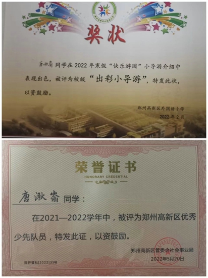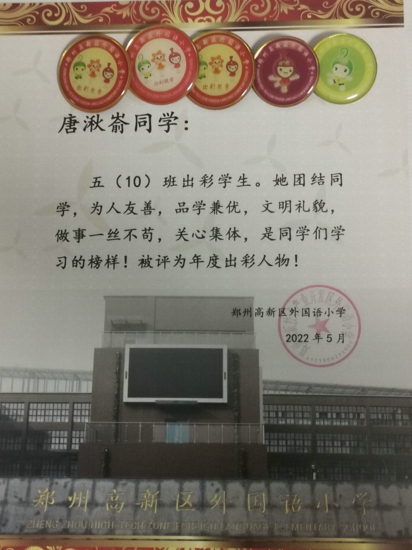 她就是鄭州高新區(qū)外國語小學(xué)出彩學(xué)生——六年級(jí)(10)班唐湫崳。