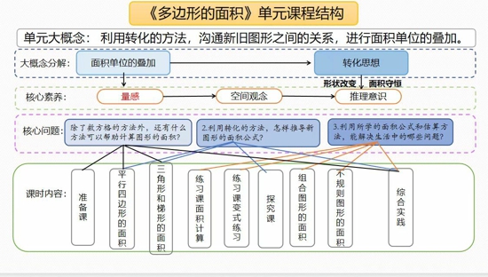 接著,第二組由季艷枝老師進(jìn)行匯報。對核心素養(yǎng)進(jìn)行再次整合,保留了推理意識和空間觀念,對量感究竟是否保留提出疑問!最后季老師呈現(xiàn)了清晰明了的單元課程結(jié)構(gòu)圖為后續(xù)的單元整體教學(xué)研究提供了明晰的思路。