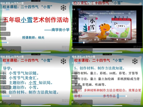 活動前,學校老師為學生精心制作了節(jié)氣宣講視頻,帶領學生了解了小雪節(jié)氣的由來、氣候特點、物候特征、民間習俗等,讓學生在愉快的觀賞中了解、感悟小雪節(jié)氣,讓祖國的傳統(tǒng)歷史文化與美德能代代弘揚與傳承,讓民族文化根植于每個學生的心田。