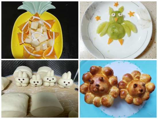 小手準(zhǔn)備好食材,樂享廚藝我最棒。一二年級(jí)的小嫩芽們積極參與,各顯神通,跟著爸爸媽媽學(xué)習(xí)簡單的烹飪技能。擇菜、洗菜,搟餃子皮、包餃子,削水果、擺拼盤……巧手慧心,分享美食。瞧!這些富有創(chuàng)意的果蔬拼盤、美味甜點(diǎn),都出自小嫩芽們靈巧的小手哦,一起來為他們點(diǎn)贊吧!