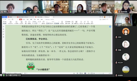 徐小娜老師以《青蛙賣泥塘》為例,緊扣主題,依托單元大情境——六一節(jié)目展演,不僅設(shè)計了有趣的活動,如小青蛙過河——生字檢測、小青蛙賞花——詞語檢測……,而且聚焦問題串——誰賣?賣給誰?為什么買?賣出去了嗎?為什么……精心設(shè)計了學(xué)生手冊及評價量表,為演好故事打下堅實的基礎(chǔ)。趙新婷和肖春艷老師則以《小毛蟲》為例分享第八九課時教學(xué)設(shè)計。趙老師基于學(xué)情的深入分析,采用“對比”的方法,課始以昆蟲生機勃勃和小毛蟲慵懶的圖片感知小毛蟲的特點,然后引領(lǐng)學(xué)生初讀課文,走進小毛蟲……......激發(fā)學(xué)生閱讀興趣。肖老師作為接力賽的第三棒,設(shè)置有趣的活動,有效引導(dǎo)學(xué)生自主學(xué)習(xí),借助關(guān)鍵信息完整講述故事,整個教學(xué)設(shè)計環(huán)環(huán)相扣,層層遞進。