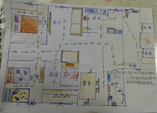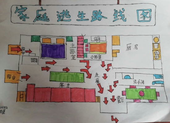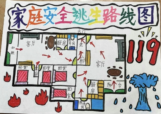 首先,學生們根據(jù)自己家樓層特點找到正確的逃生出口,然后,清晰地標注出每一條逃生路線,最后,詳細地繪出火災(zāi)初起時的應(yīng)對措施,如及時撥打119,避開電梯從樓梯逃生等,可謂精彩紛呈。