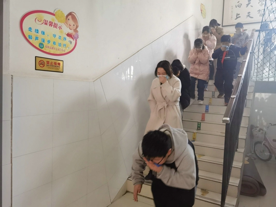一陣急促的警報聲拉開了“師生安全疏散演練”活動的帷幕,聽到警報聲,各位老師立即到達指定崗位,指導學生快速疏散,各班主任老師帶領學生彎著腰、貓著步,捂住口鼻,沿著學校指定樓梯口快速前進,有序撤離到學校操場的安全地帶,隨即各任課教師清點人數(shù),并層層向上匯報。