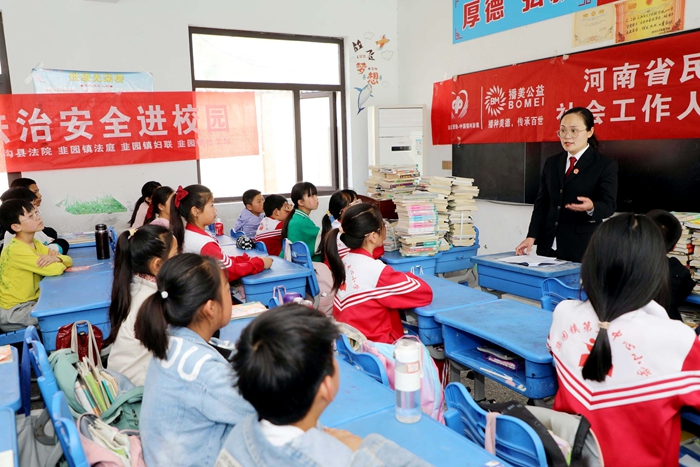 扶溝縣韭園法庭聯(lián)合社工站、鎮(zhèn)婦聯(lián)送法贈(zèng)書(shū)進(jìn)校園