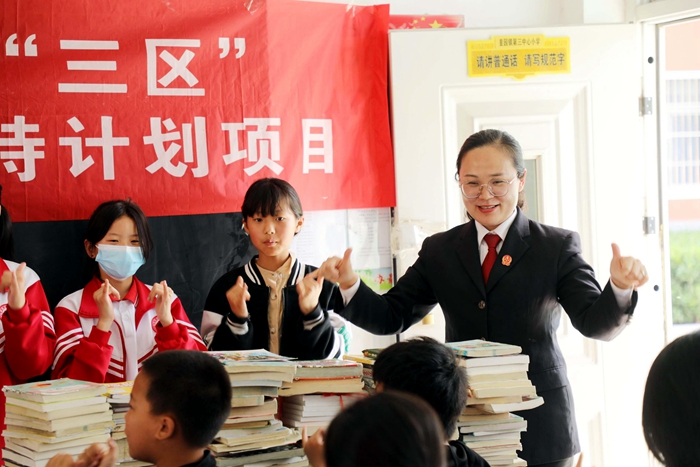 活動(dòng)最后,韭園法庭與社工站、鎮(zhèn)婦聯(lián)一起向韭園鎮(zhèn)第三中心小學(xué)贈(zèng)送圖書(shū)500多冊(cè),作為孩子們的日常讀本。希望通過(guò)贈(zèng)書(shū)活動(dòng)讓更多的青少年學(xué)生受到良好的法治教育,進(jìn)一步培養(yǎng)法治精神。