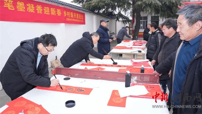 座談會后,“迎新春·送春聯(lián)”文化惠民活動在村部大院熱烈展開。活動特邀中國水利書法家協(xié)會副主席李憲章、寒潮,理事兼河南省水利書法家協(xié)會主席胡建剛,理事李中飛現(xiàn)場揮毫。紅紙鋪展,墨香四溢,書法家們應村民之請,執(zhí)筆書寫下一幅幅寓意吉祥的春聯(lián)和飽滿的“福”字。“躍馬揚鞭奔富路,迎春接福啟新章”“鄉(xiāng)村振興馳駿馬,民生幸福沐春風”……字里行間寄托著美好的祝愿。村民們手捧墨跡未干的春聯(lián),笑容洋溢,現(xiàn)場充滿濃厚的喜慶氣氛。