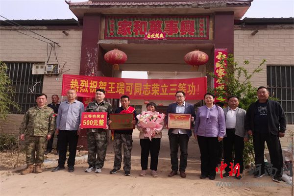 中新河南網(wǎng)4月18日電:為弘揚(yáng)擁軍優(yōu)屬光榮傳統(tǒng),營(yíng)造全社會(huì)尊崇軍人的良好氛圍,4月18日上午,開(kāi)封市示范區(qū)杏花營(yíng)農(nóng)場(chǎng)聯(lián)合區(qū)退役軍人事務(wù)局、區(qū)人民武裝部為榮立三等功的現(xiàn)役軍人家庭送上立功喜報(bào),讓軍人軍屬共享榮耀和喜悅。