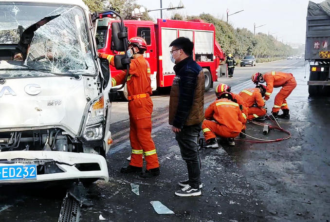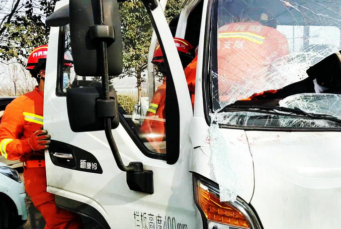 河南禹州:兩輛貨車發(fā)生追尾一人被困 消防隊員迅速趕赴破拆救援