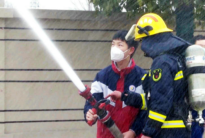 在“藍朋友”的指導下,同學們還紛紛穿上戰(zhàn)斗服、抱起水槍,模擬消防員滅火的過程,著實過了一把當消防員的癮。