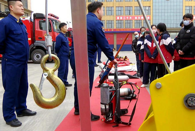 隨后,講解員帶領同學們觀看了攀登掛鉤梯、4樓攀爬繩索、初戰(zhàn)快速出水控火操等日常訓練科目。