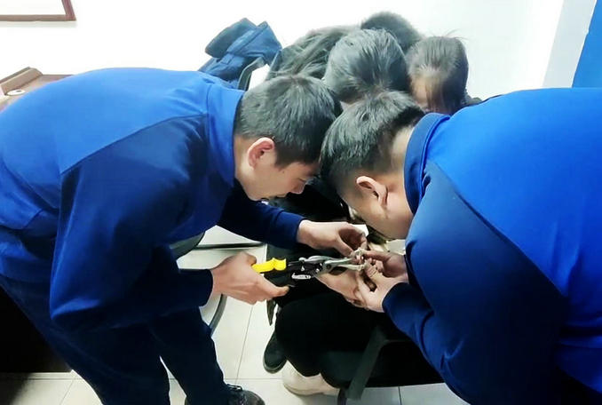 根據(jù)現(xiàn)場情況,消防救援人員一邊安撫女子的情緒,一邊使用老虎鉗、絕緣剪等工具展開救援。