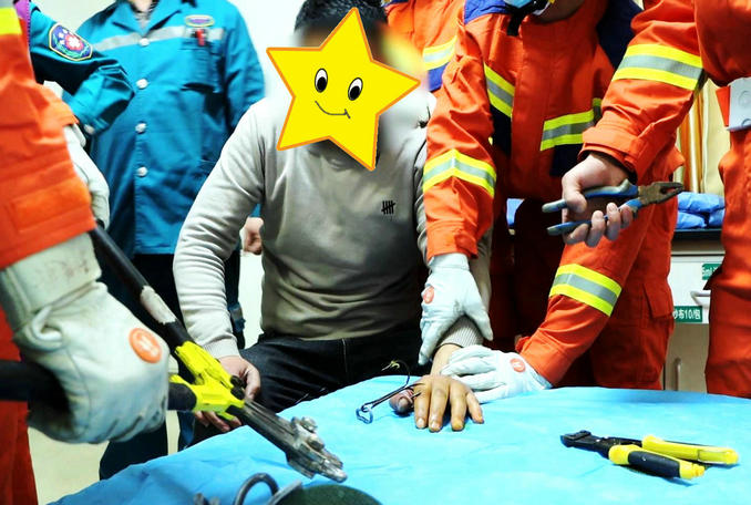 消防救援人員到達(dá)醫(yī)院后發(fā)現(xiàn):該男子的手指被滾鉤刺穿,滾鉤的前面有倒刺,后面有阻擋物,這給救援工作帶來了諸多困難。