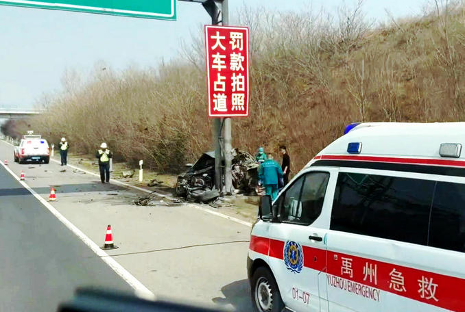 河南禹州:鄭欒高速轎車撞上路牌支柱 消防隊員迅速趕赴破拆救援