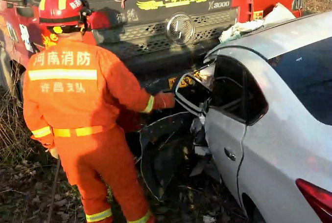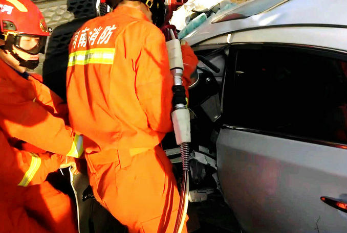 河南襄城:半掛車避讓三輪車撞上轎車 消防隊(duì)員立即趕赴破拆救援