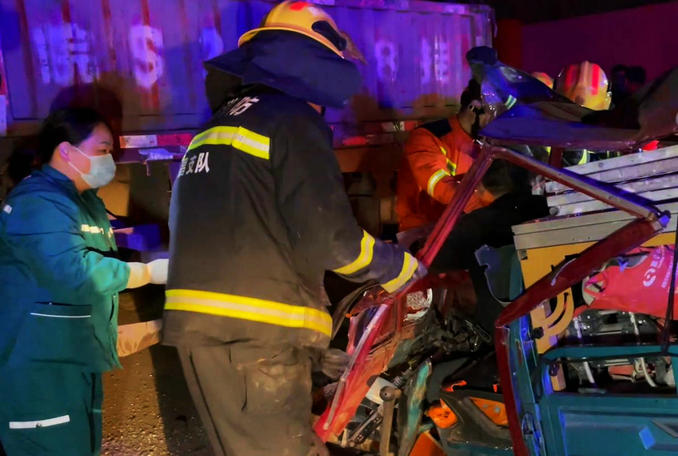 本網(wǎng)訊(張培 姚浩瀚)3月24日23時(shí)31分,許昌市消防救援支隊(duì)接到報(bào)警稱:許州路瑞貝卡大道交叉口,一輛三輪車追尾半掛車,三輪車司機(jī)受傷被困。接警后,指揮中心立即調(diào)派消防救援人員火速趕赴現(xiàn)場(chǎng)處置救援。