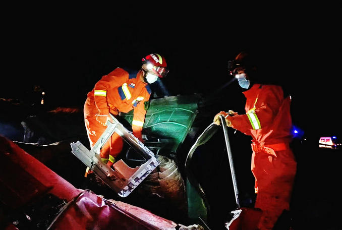 到達現(xiàn)場后,消防救援人員發(fā)現(xiàn):發(fā)生側(cè)翻貨車的駕駛室已經(jīng)嚴(yán)重變形,破損的車輛零部件灑落一地,駕駛室內(nèi)1名司機被困。