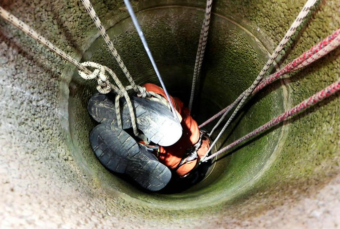 考慮到狹窄的深井內(nèi)缺氧,現(xiàn)場的消防救援人員首先用空氣呼吸器氣瓶向井內(nèi)供氧。隨后,由一名體型較小的消防員攜帶繩索及腰帶采取“倒掛金鉤”的方式垂直下降深井內(nèi)營救。